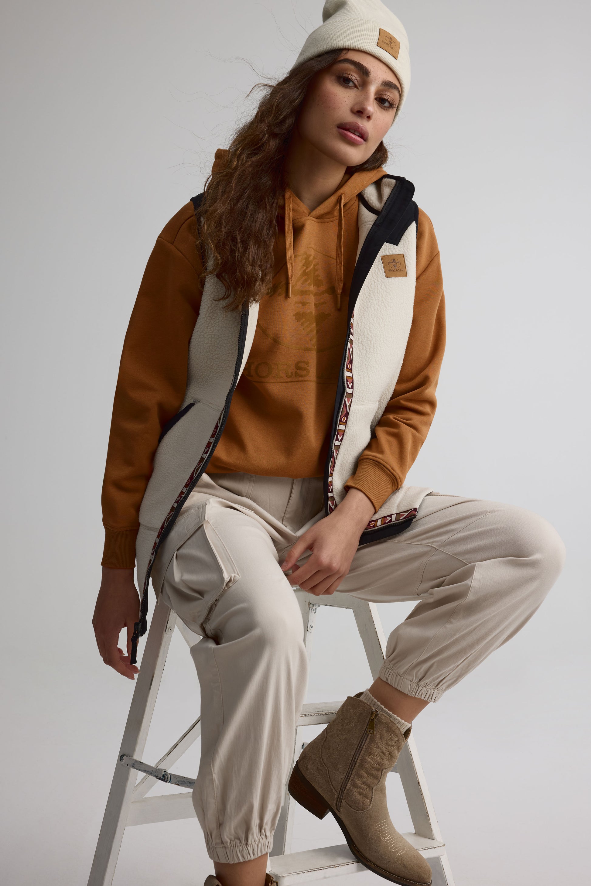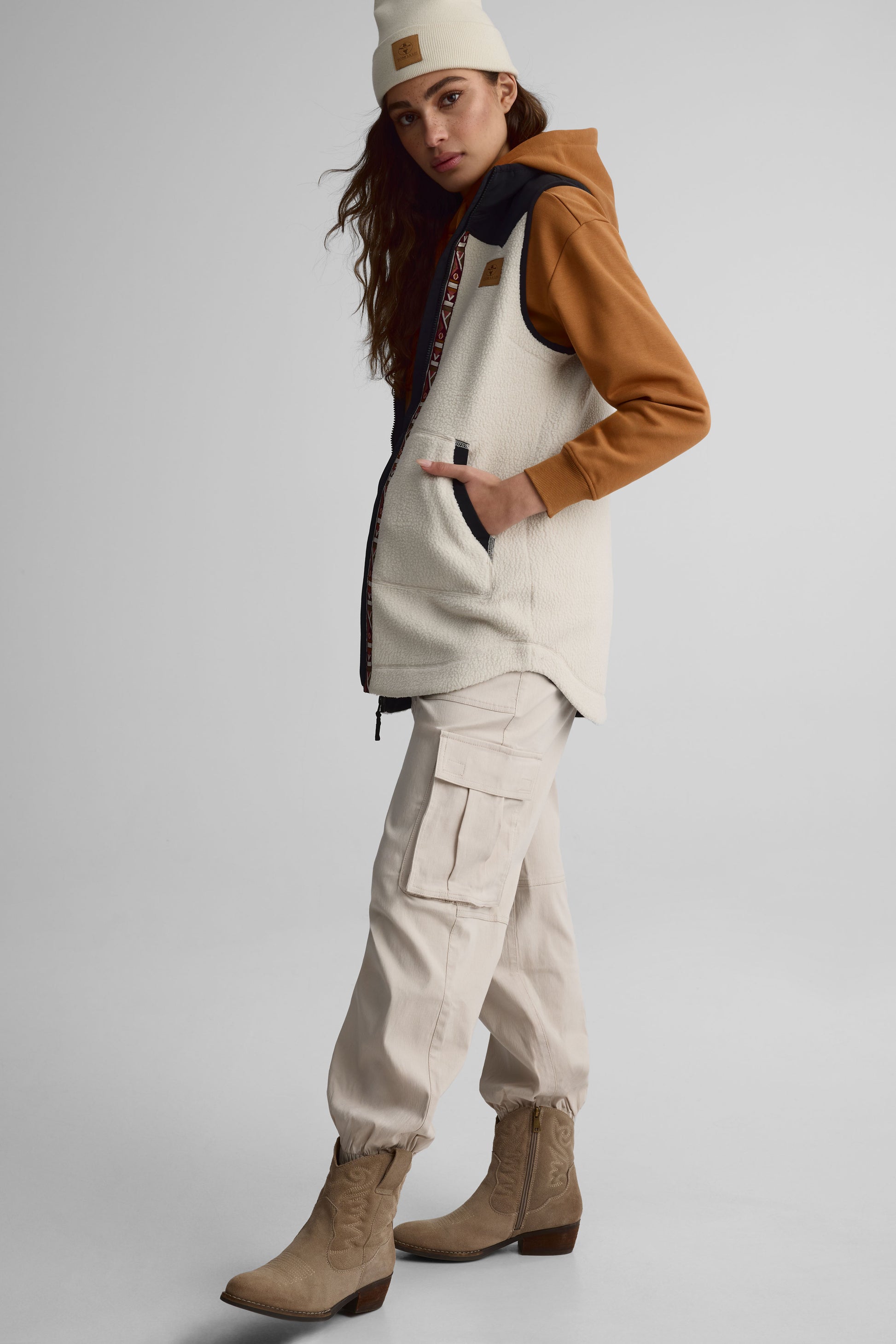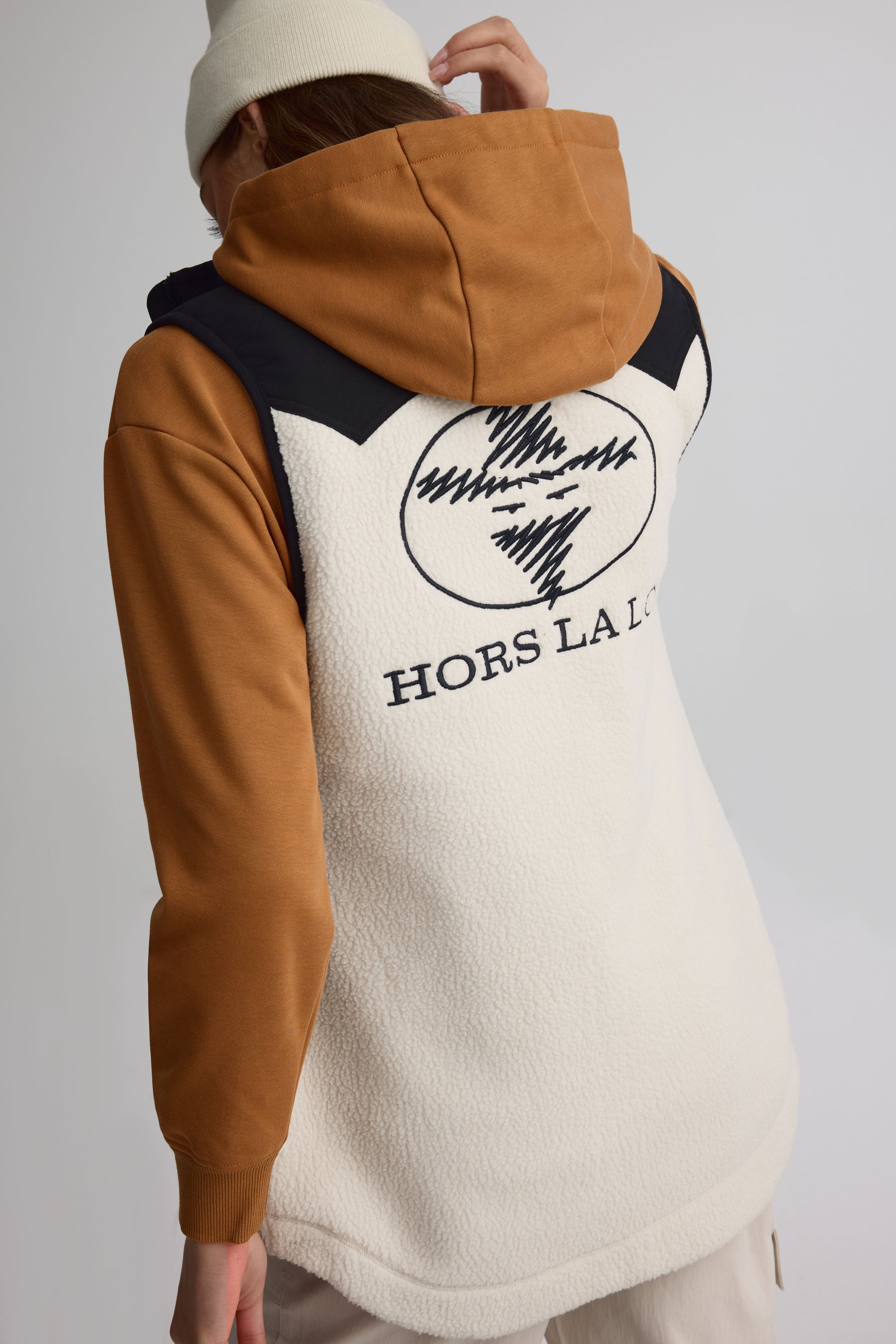 Designed for crisp days and cooler temps, The All-Around is that standout piece that blends warmth with character. Its high collar blocks the wind, while the long, sleeveless cut lets you layer freely—no bulk, just style. The ultra-soft sherpa keeps your core warm where it counts, and the practical pockets add a functional edge. Throw it over a sweatshirt or a crewneck when you want extra warmth—whether you're in the woods, on the move, or in between stops. The signature touch? A zip-front closure with a custom pattern, a subtle nod to the North, wide-open spaces… and your rebellious streak.